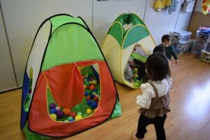 お部屋にテントとボールを沢山出して、ボールプールを楽しみました。