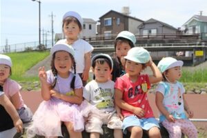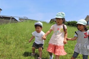 イルカ組、パンダ組は手を繋ぎ、桃の木公園