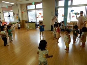 今日はペンギン組のお友達はイルカ組のお友達と一緒にリズムを行ないました。
