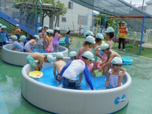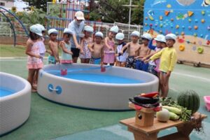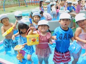 幼稚部のプール開きでは、子どもたちも待ちに待っていた行事です
