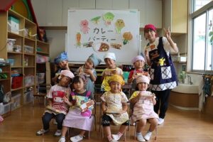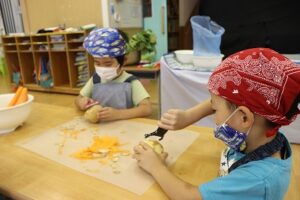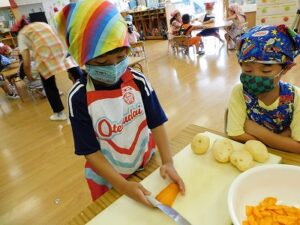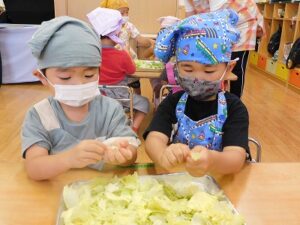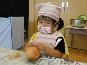 パンダ組は玉ねぎの皮むき、レタス千切り
