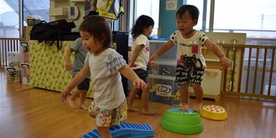 本日は雨のため、午前中は1歳児と2歳児保育室を広く使いサーキット遊びをしました