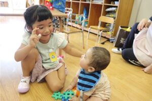 0歳児のお友達にやさしく声をかける姿が見られていました