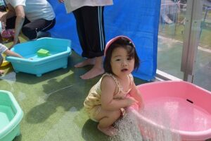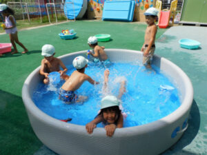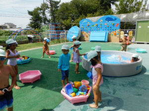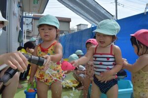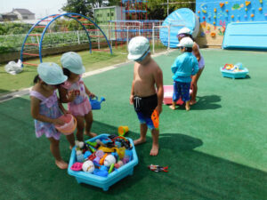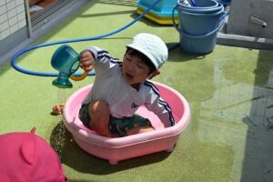 自分で体に水を掛けたり、じょうろや水鉄砲を使ってお友達や先生に水をかけたりして