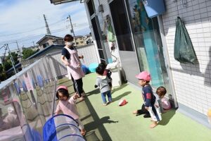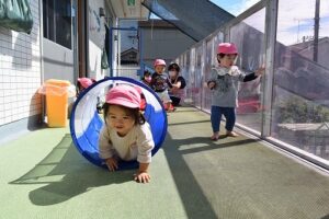 今日はベランダに出て、山登りやトンネルくぐりに挑戦です。