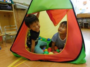 今日はお部屋の中で、テントとボールを出して遊びました。