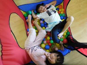 ボールをテントいっぱいに敷き詰めて、ベットを作ったりしているお友達や