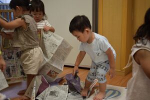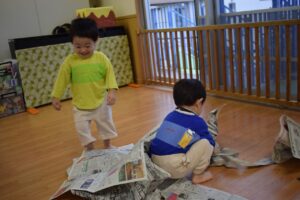 破いた新聞紙を下に敷いて踏む感触を楽しんだりしていました