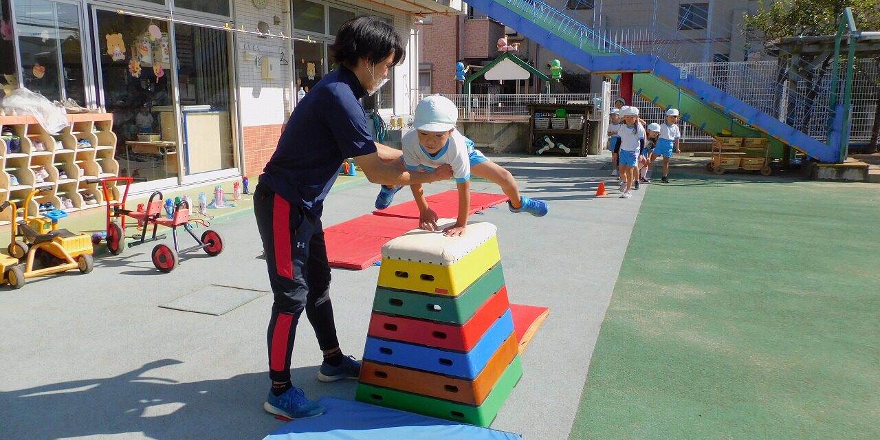 体操講師のまー君先生の方では跳び箱を縦にして飛ぶ練習を行いました