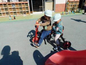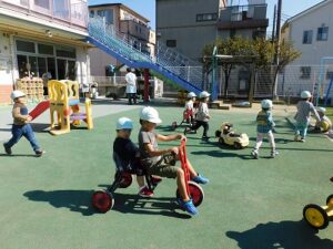 三輪車をしたり追いかけっこをしたりそれぞれみんなが好きな遊びを楽しみました。