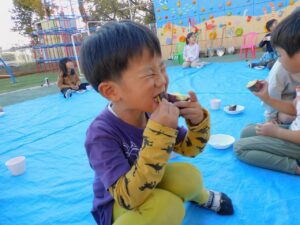 5歳児は焼きあがったサツマイモを園庭で食べ、「美味しい!」という声がたくさんあり、とても楽しかった1日となりました