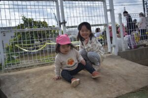 0歳児のラッコ組は3歳児のパンダ組と一緒に園庭で遊びました
