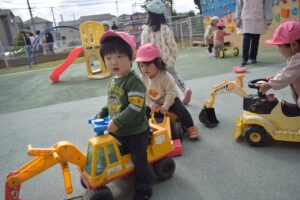 小さな乗り物に0歳児が乗り園庭内を楽しそうに移動していました
