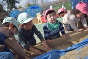 砂場も一緒に取り組みパンダ組がお山を作ったり、カップに砂を詰めて