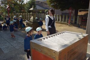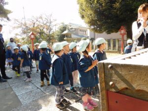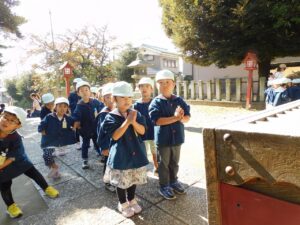 3歳児のパンダ組と4歳児のキリン組でペアなり神社まで行きました