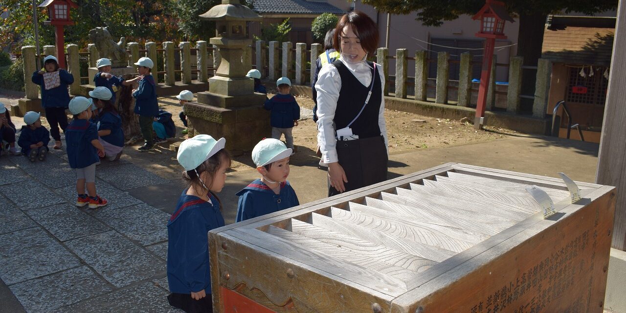3歳児のパンダ組と4歳児のキリン組でペアなり神社まで行きました