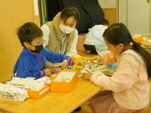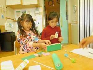 はさみを上手に使ったり、シールやペンで書きながら、オリジナルのおもちゃ作りを楽しんでいました。