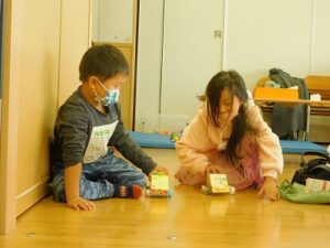 牛乳パックを使って、車とコマの制作を親子で楽しみました。