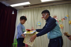 3枚のお友達が絵画展に入賞し、賞状と記念品の授与を行いました。