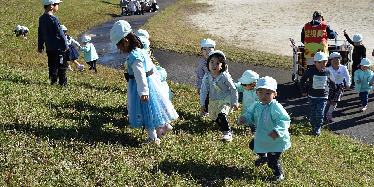 治水地につくと、草原の坂道で遊び、バランスをとって