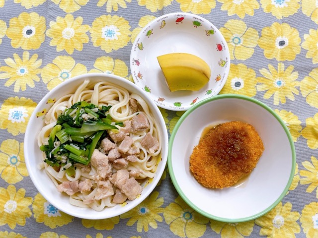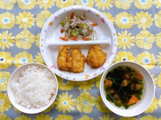 ~今日のお給食~ ・ツナと豆腐の落とし揚げ ・キャベツのゆかり和え ・ごはん ・春雨スープ ・モモ ~今日のおやつ~ ・豆乳 ・ミルクスティック ・お…