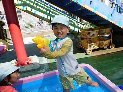 今日パンダ組のお友達はわくわくタイムに プール遊びを行ないました。 準備体操をしっかりと行い、 プール遊び開始!! 水鉄砲を発見し、先生やお友達に向かって 「バーン…