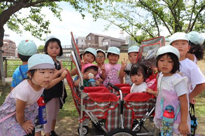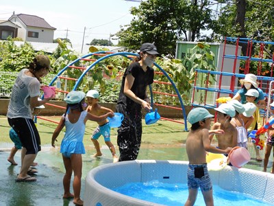 今日はいい天気だったので、お外で水遊びをしました♪ お友達と水を掛け合ったり、バケツに水を汲んだりして楽しみました! 夏ならではの遊びをみんなで楽しむことが出来まし…