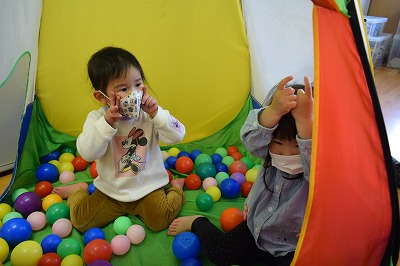 今日はイルカ組の様子です。 お部屋にテントとボールを沢山出して、ボールプールを楽しみました。 テントをお店屋さんに見立てて、お客さんにな…