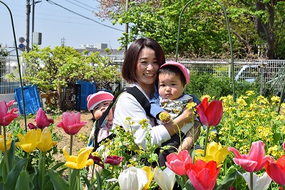 今日ラッコ組のお友達は外に出て外気浴へ! 園の畑にきれいな菜の花と チューリップが咲いていたので 先生と写真を撮りました。 先生の抱っこやおんぶが心地よかったようで…