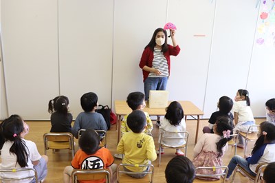 今日は、4歳児キリン組の様子です! 午前中は英語指導がありましたが、今年度初めてアルマ先生の英語指導でした 子どもたちはどんなことが始まるのかなと興味を示しながら話を聞いていました 最初は、天気について行い、「晴れ」「雨…