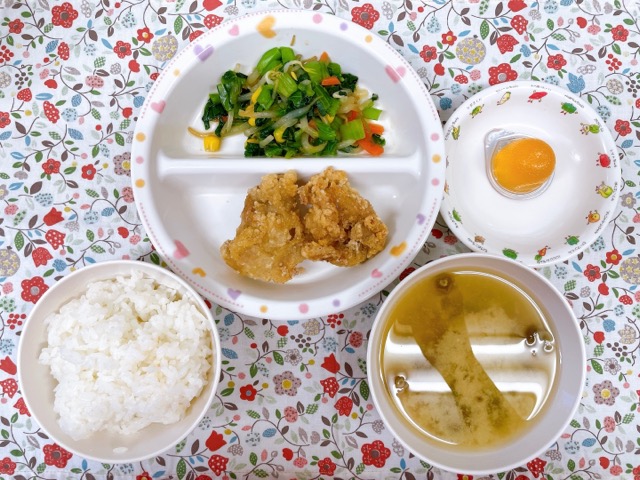 ~今日のお給食~ ・鶏のからあげ ・小松菜ともやしの中華和え ・ごはん ・味噌汁(わかめ・なめこ・豆腐) ・ゼリー ~今日のおやつ~ ・牛乳 ・そうめ…