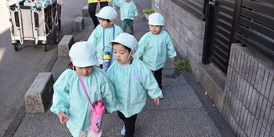 保育部のお友達はみんなで手をつないで保育園の周りをお散歩に行きました。