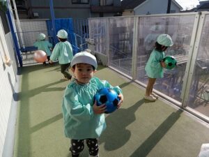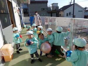 シャボン玉遊びの後は、ボール遊びをしました。
