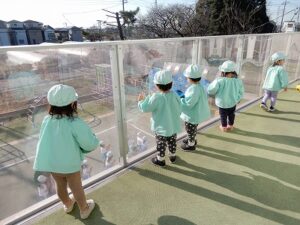 園庭では幼稚部のお友達が体操指導を受けていて、ペンギン組のお友達は