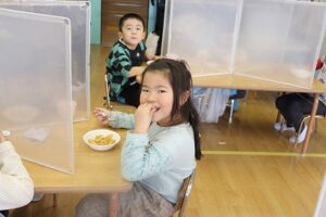「牛乳にかけると、牛乳も甘くなっておいしいよね~!!」というお友達の言葉に「じゃあかけてみよう!!」とやってみる子もいて、仲良く食べていました。