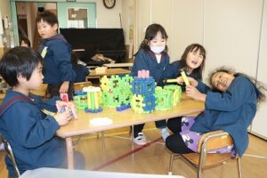 キリン組のお友達はおやつのコーンフレークを食べるときに、お友達と話が弾んでいました。