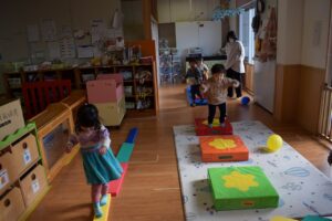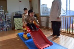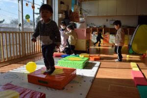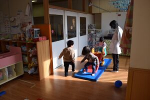 マットや、滑り台、平たい平均台など様々なものを使用しています
