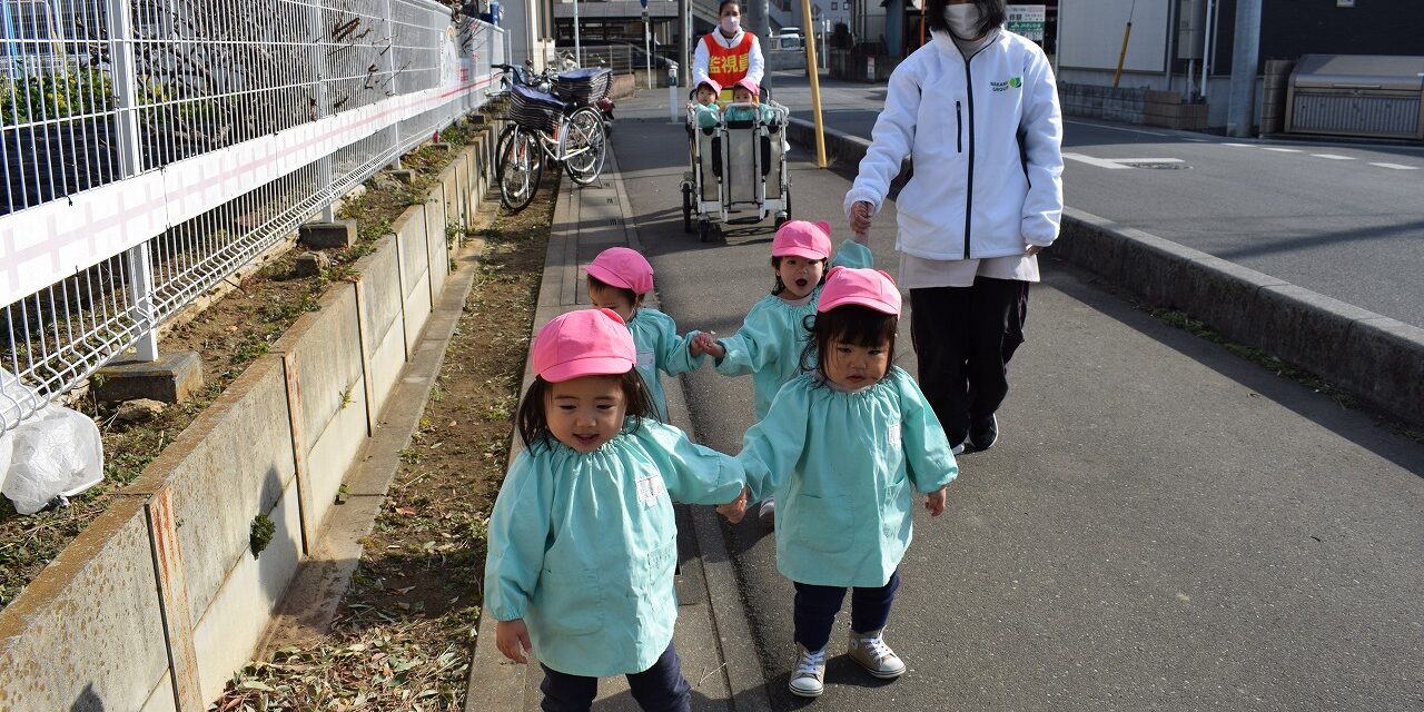 友達や保育者と散歩を楽しんでいます