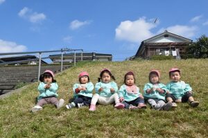 みんなで座って芝生を取って、上の投げ「わあ~!!」