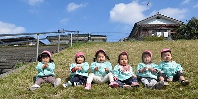 みんなで座って芝生を取って、上の投げ「わあ~!!」