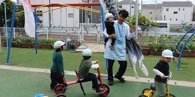 乗り物が人気で、三輪車に乗ってみんなで仲良く遊んでいました!