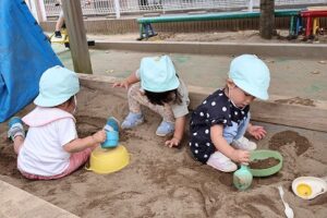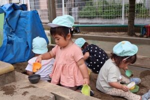 お砂場で、カップにお砂を入れて、お友達や先生と一緒に楽しく遊んでいます。