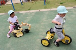 三輪車や、乗り物にも自ら乗り、地面を蹴りながら進めるようになり、