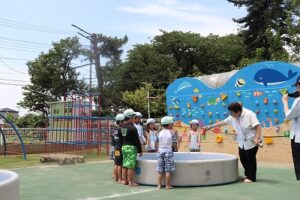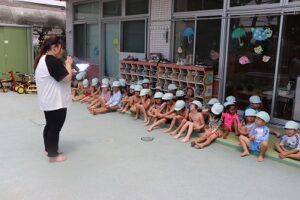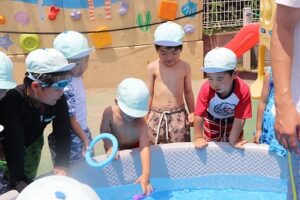 みんなが安全に水遊びが出来るように、ライオン組さんがお塩をまいたり