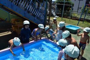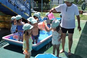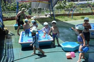お友達とバタ足を楽しんだり、バケツに水をすくって、お水の掛け合いっこが始まりました。