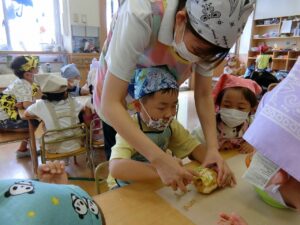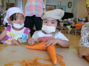 4歳児キリン組は、枝豆を枝から取り、ピーラーを使ってじゃがいもと、にんじんの皮むきを行いました