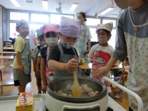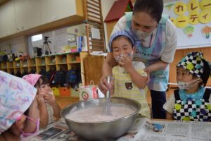 作る過程の中で、子ども達は野菜を炒める匂いやカレーの匂いに誘われて「お腹がすいたー!」「はやくたべたーい!」