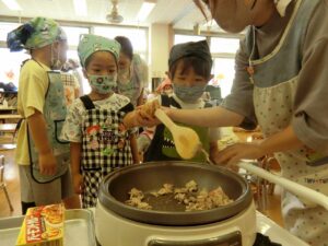今日は実際に豚肉を焼いたり、野菜を炒めたり、カレー作りをいちから体験しました