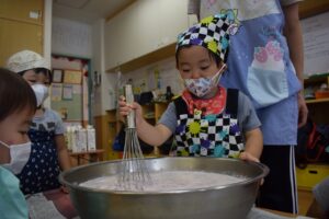 2歳児のイルカ組から参加し、野菜の皮むきや、お米を研ぐ