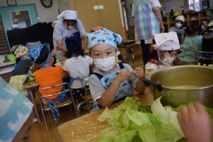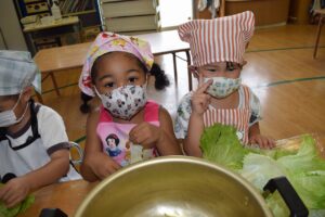 3歳児パンダ組は、スープ用のレタスをちぎり、玉ねぎの皮むきを行いました